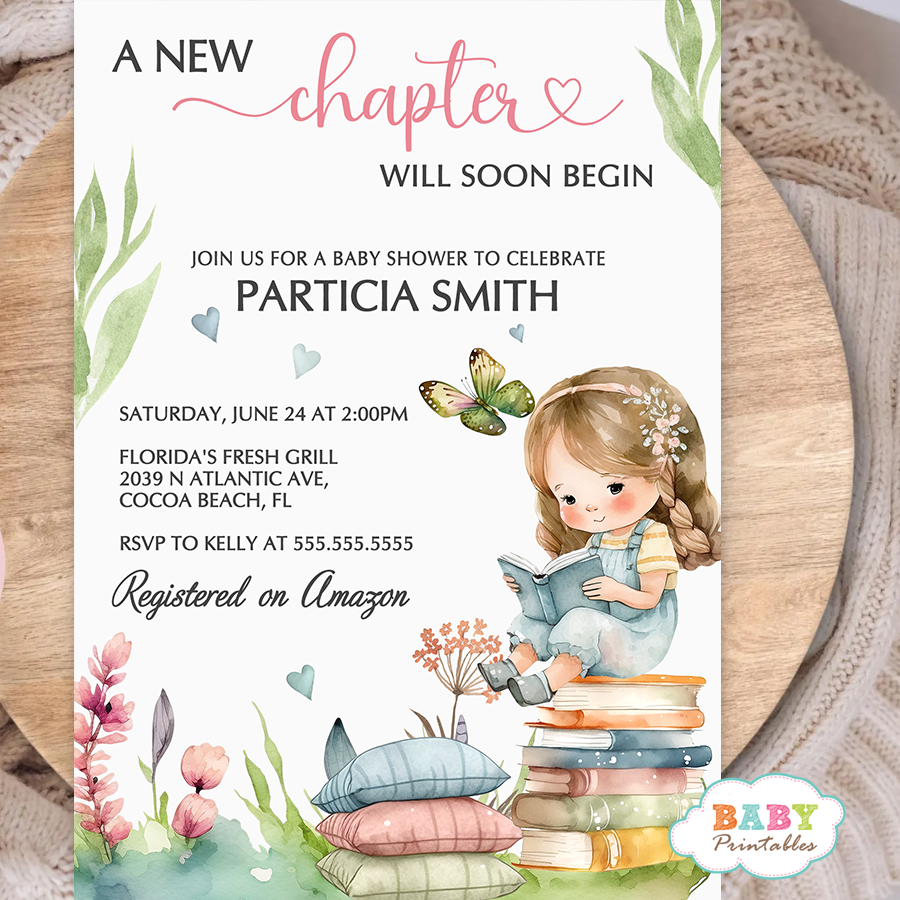 Celebrate a beautiful new beginning with this heartfelt “A New Chapter Will Soon Begin” baby shower invitation, featuring a soft storybook theme, delicate florals, and a sweet illustration of a little girl reading. This elegant and meaningful design is perfect for a baby girl shower, baby sprinkle, or book-themed baby shower celebration.
