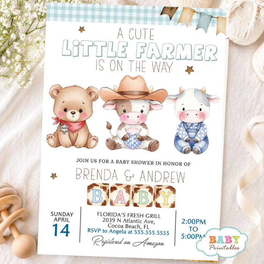 With cute illustrations of a teddy bear, cow, and calf dressed in farm-inspired outfits, along with fun “BABY” block details, this invitation creates a joyful and welcoming atmosphere. The soft blue and neutral tones make it ideal for a baby boy shower or gender-neutral baby shower.
