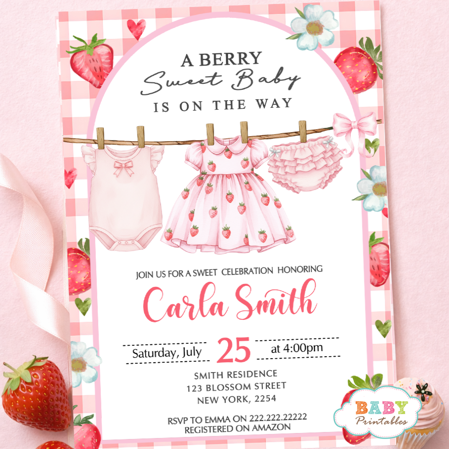 Celebrate your little bundle of joy with this adorable Berry Sweet Baby Shower Invitation featuring a charming clothesline baby outfit design, soft pink gingham background, and delicate watercolor strawberries. This sweet and feminine invitation is perfect for a baby girl shower, strawberry-themed party, or summer celebration.