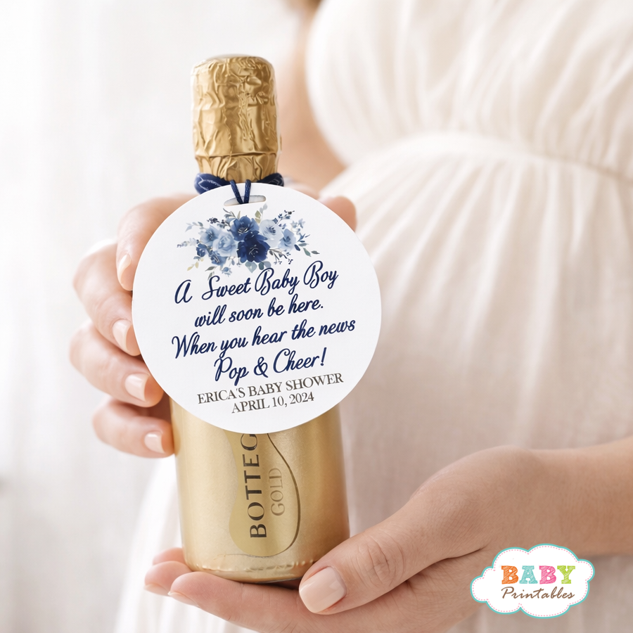 Celebrate your special day with this elegant blue floral baby shower bottle tag, perfect for mini champagne or sparkling wine favors. Featuring a soft watercolor design and the sweet message “A Sweet Baby Boy will soon be here… Pop & Cheer!”, this tag adds a luxurious and personalized touch to your baby shower.