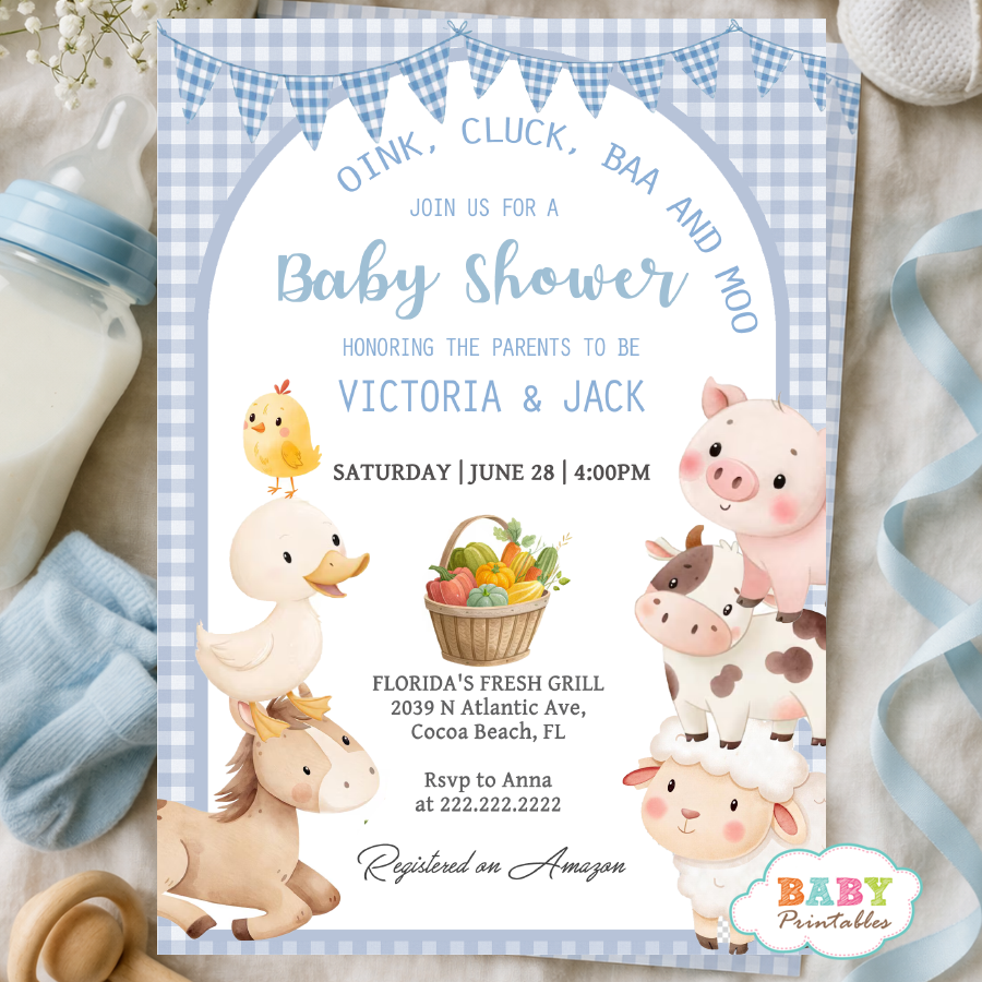 Celebrate your little one with this adorable farm-themed baby shower invitation for boys, featuring soft blue gingham, cute barnyard animals, and a playful “Oink, Cluck, Baa and Moo” theme. This charming design is perfect for a little farmer baby shower, rustic barnyard party, or country baby shower celebration.