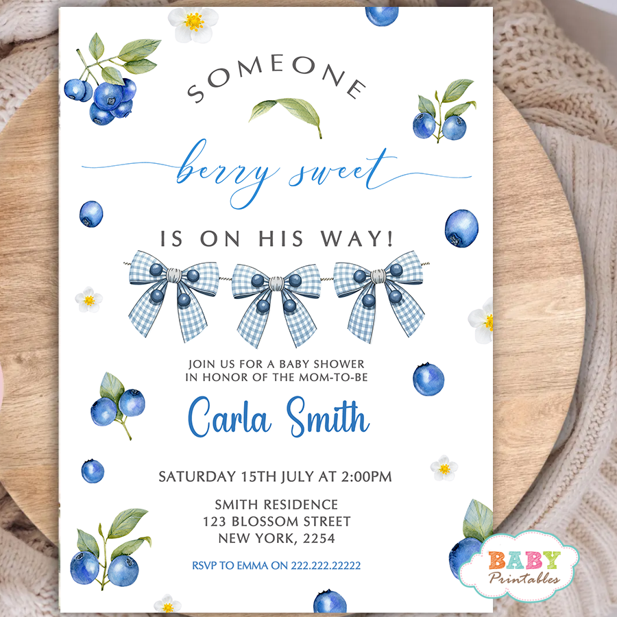 Celebrate your little bundle of joy with this elegant Someone Berry Sweet Baby Shower Invitation featuring a soft blueberry theme, delicate watercolor berries, and charming blue gingham bows. This clean and modern design is perfect for a baby boy shower, offering a timeless and stylish look for your special celebration.