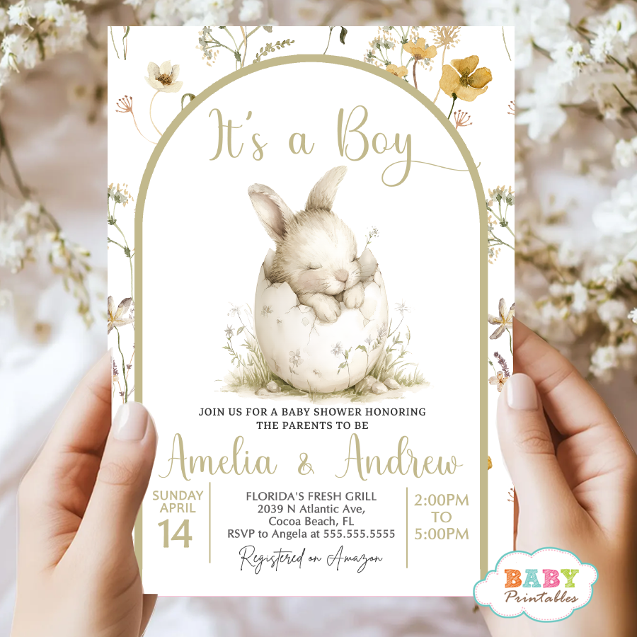 Celebrate your little one with this elegant “It’s a Boy” baby shower invitation, featuring a sweet watercolor bunny nestled in a cracked egg, surrounded by delicate neutral wildflowers. Designed in soft beige, taupe, and earthy tones, this invite is perfect for a boho baby shower, gender-neutral celebration, or rustic garden theme.