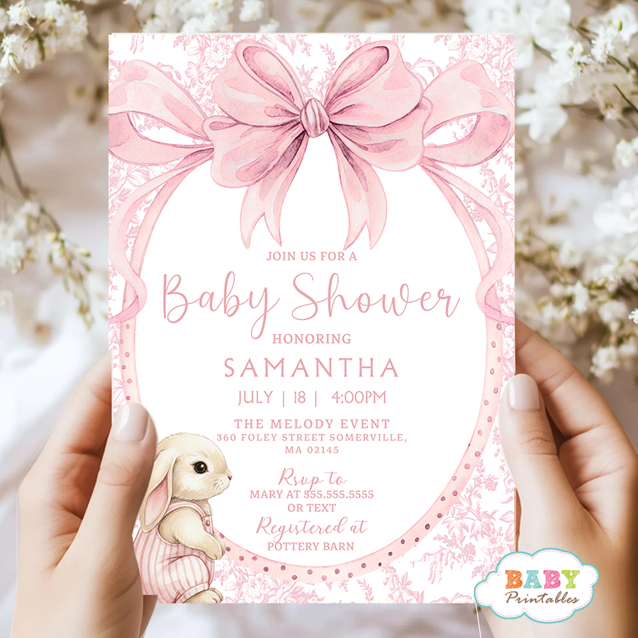 Celebrate your little one in style with this elegant coquette baby shower invitation, featuring a soft pink chinoiserie floral background, a statement bow, and an adorable bunny illustration. With its romantic blush tones and timeless feminine design, this invite is perfect for a girl baby shower, vintage-inspired celebration, or chic coquette theme.