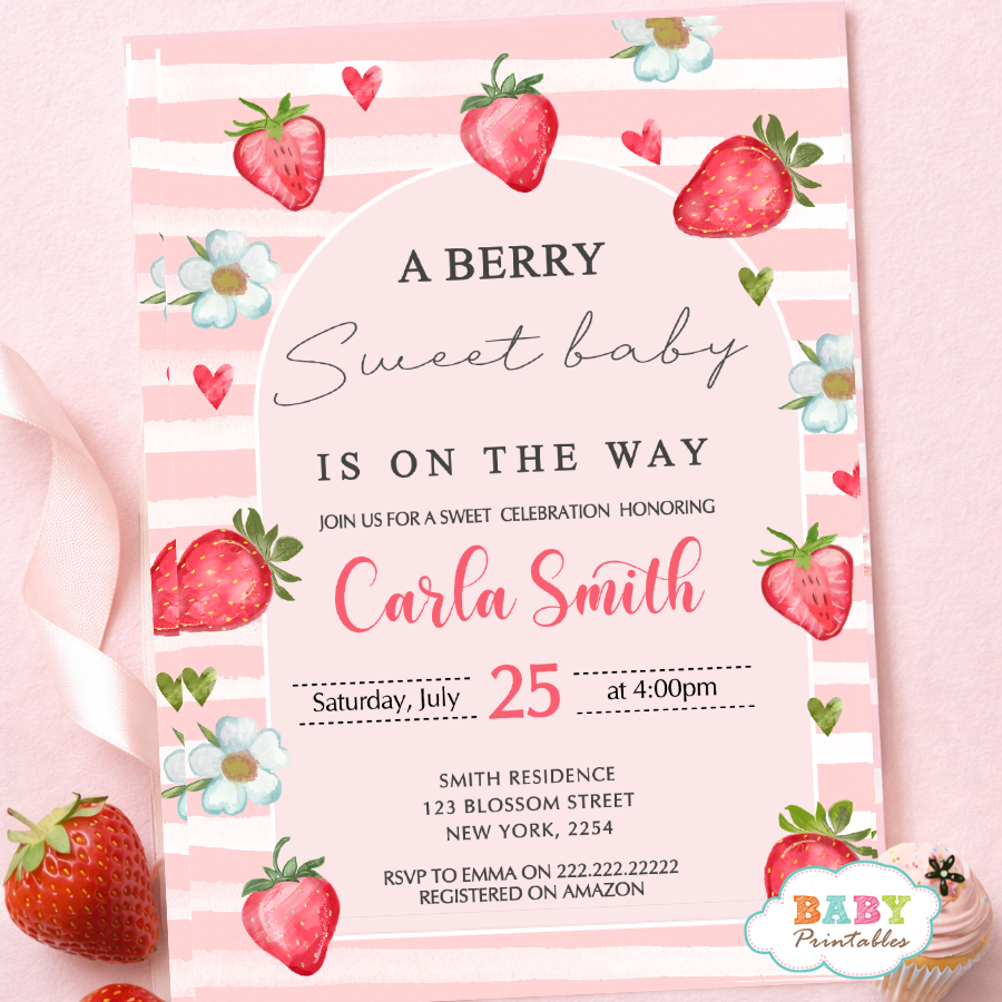 Celebrate your little one on the way with this adorable Berry Sweet Baby Shower Invitation featuring charming watercolor strawberries, soft pink tones, and a sweet, feminine design. This “A Berry Sweet Baby is on the Way” invitation is perfect for a girl baby shower, strawberry-themed party, or summer celebration.