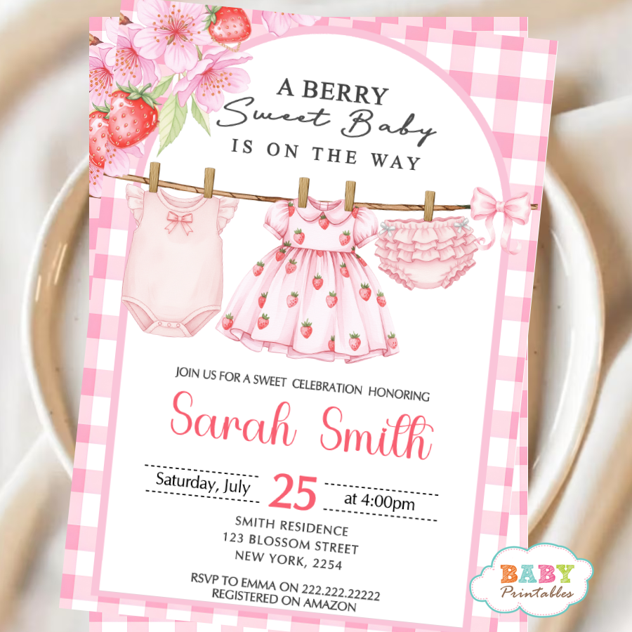 Celebrate your little one with this adorable Berry Sweet Baby Shower Invitation featuring a charming strawberry clothesline theme, soft pink gingham background, and delicate floral accents. This sweet and feminine design showcases hanging baby outfits with strawberry prints, creating the perfect invitation for a baby girl shower or summer celebration.