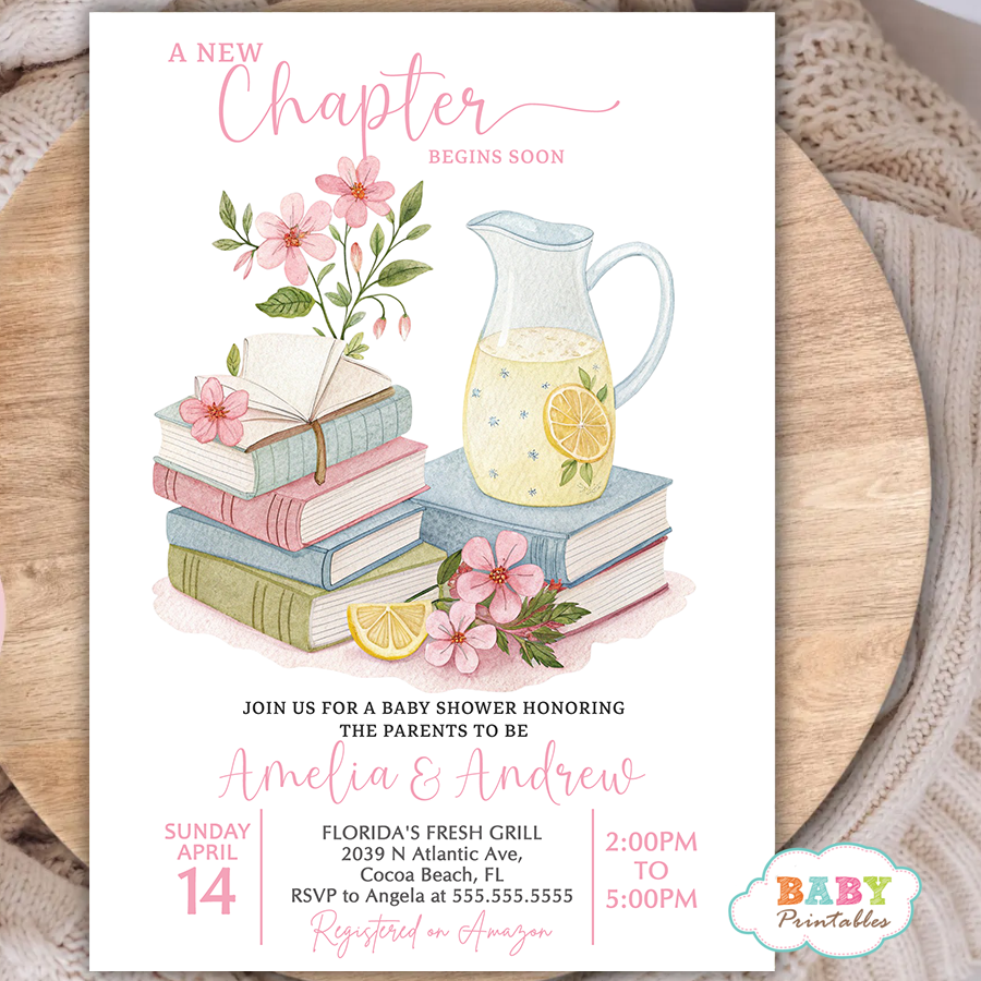 With watercolor illustrations of stacked books, blooming florals, and a charming lemonade pitcher with lemon accents, this design creates a light, joyful, and feminine atmosphere. The soft pastel tones and clean layout make it ideal for parents looking for a modern, elegant, and meaningful baby shower invitation.