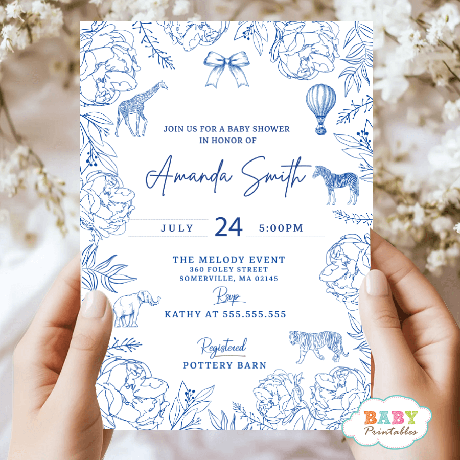 Delicate botanical details and a dusty blue color palette bring classic French toile charm to this luxury baby shower invitation. Ideal for a boy baby shower or a gender-neutral nursery celebration, this design blends traditional elegance with playful safari elements.